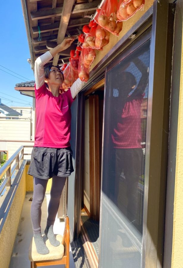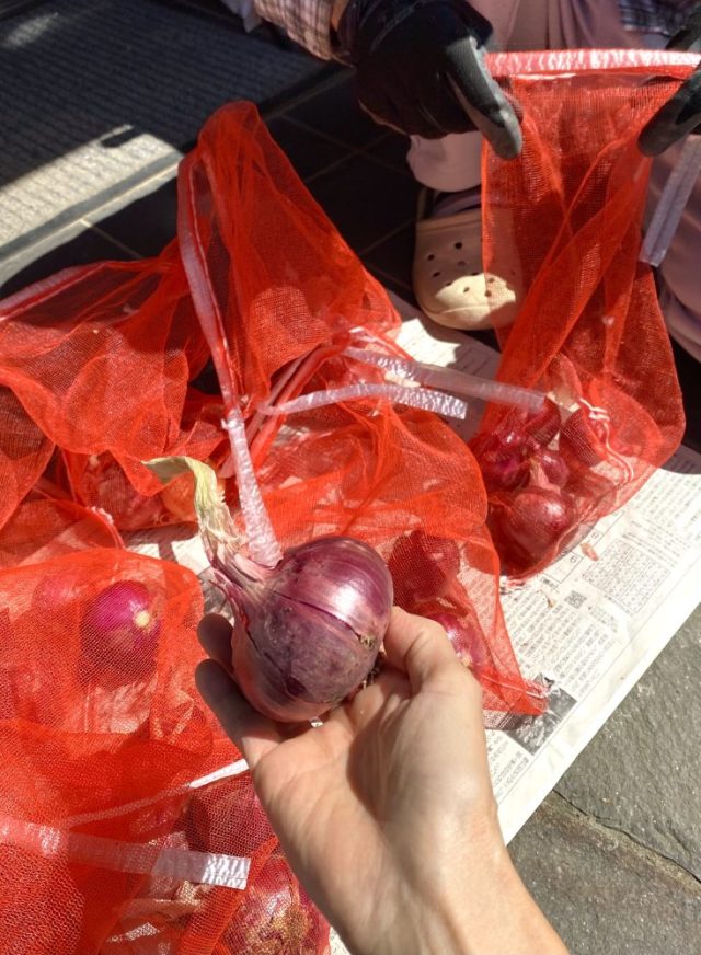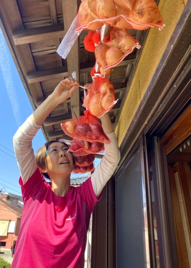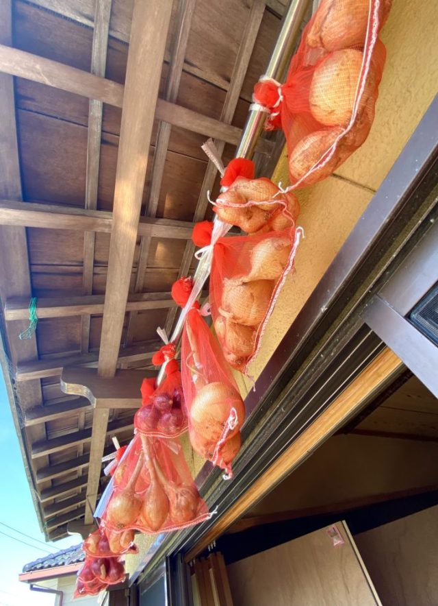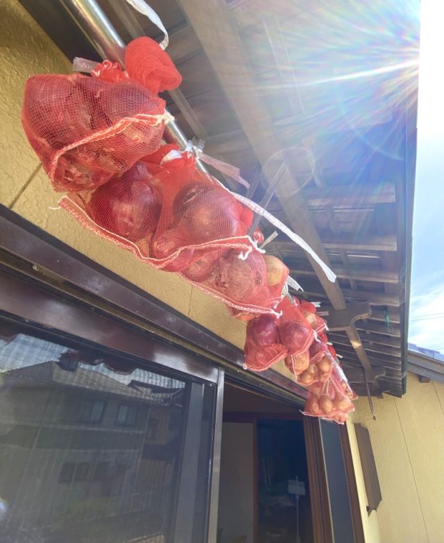 ネットに入れてじゃんじゃん吊るす〜。実は前回、白玉ねぎを吊るした際、ネット(袋)が長すぎて雨に濡れてしまったので