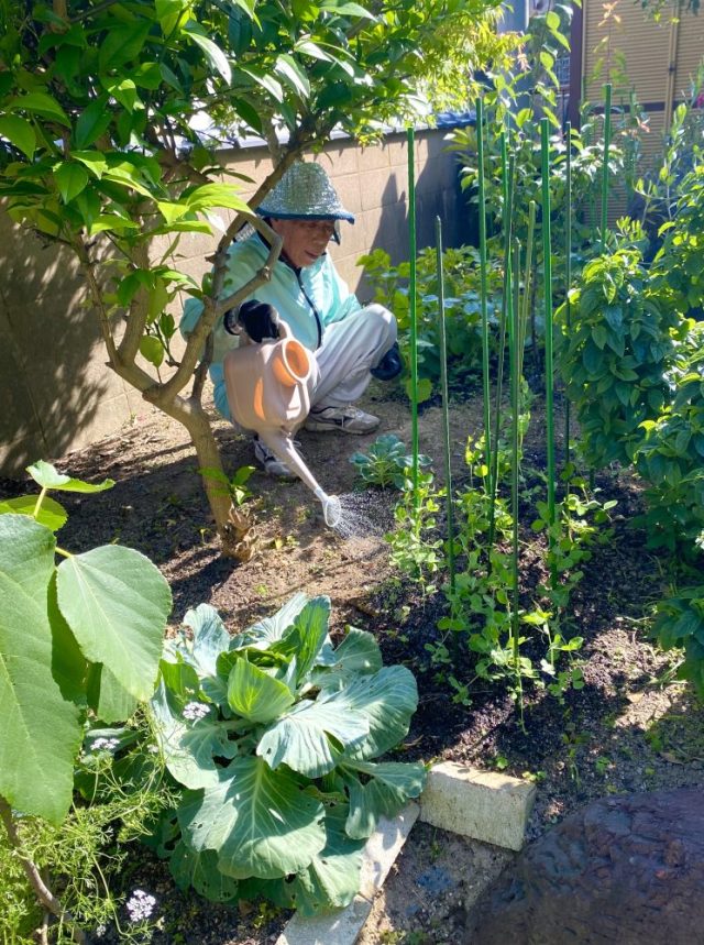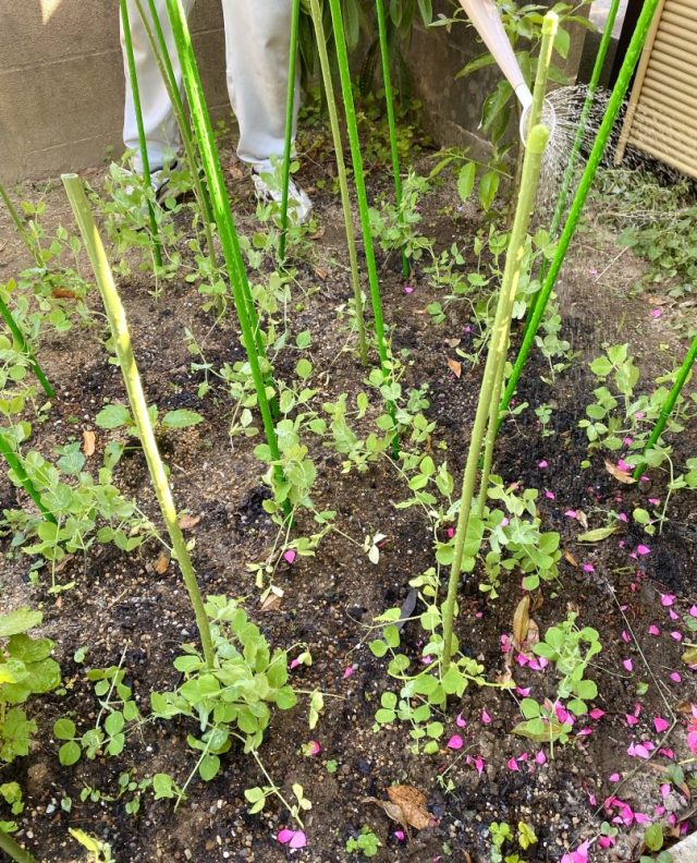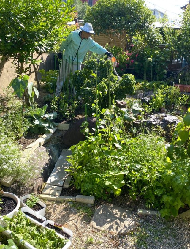 さて。2階のベランダから見下ろすと、父が庭作業中。蚊に刺されないよう完全防備。お気に入りのスナップえんどうたちに