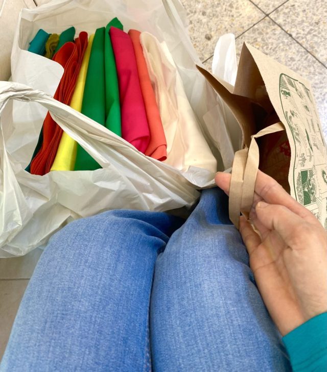 忘れてた。布って、めちゃくちゃ重いのだ〜。これからまだ地下鉄、名鉄を乗り換え、豊橋まで帰らねばならんのに。袋に美しく収まってはいるが、9色×3メートル&1色×5メートル。