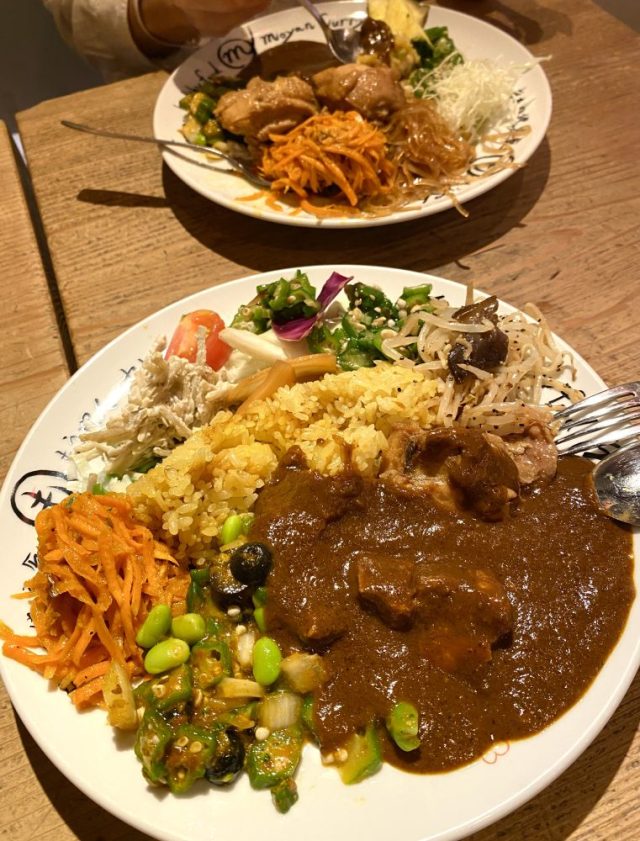 まずはカレーランチでエネルギーチャージ。大皿1枚を手渡され、カレー、ごはん、野菜各種、タンドリーチキン