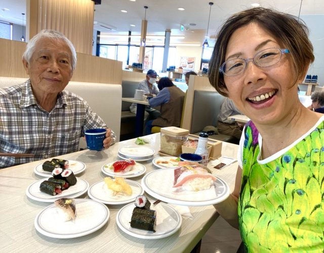 「歩いたらお腹すいたね」「回転寿司行くか〜」