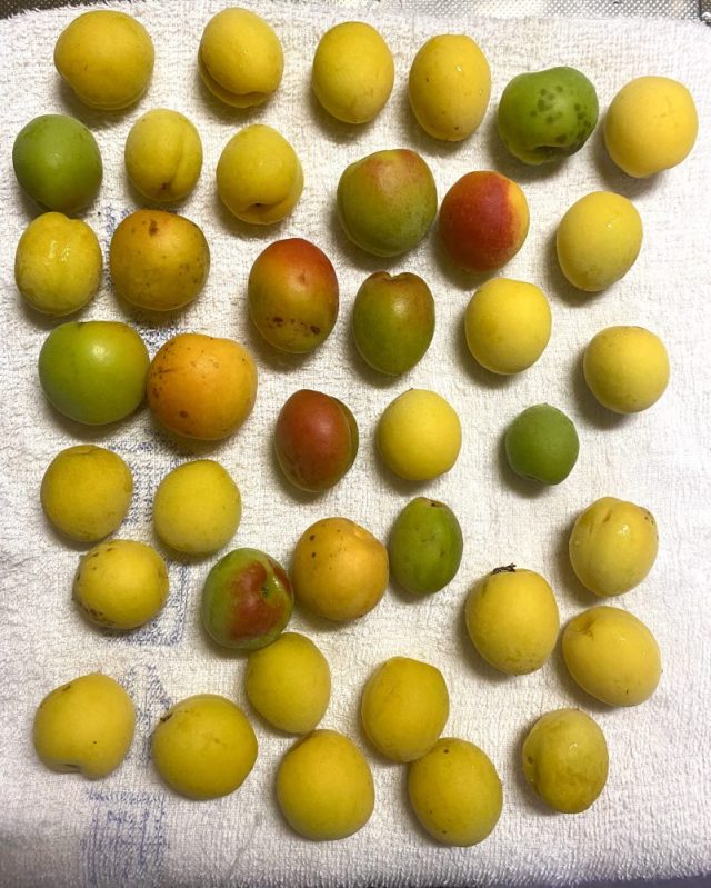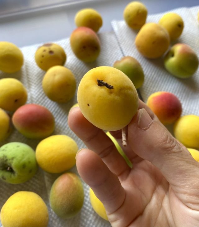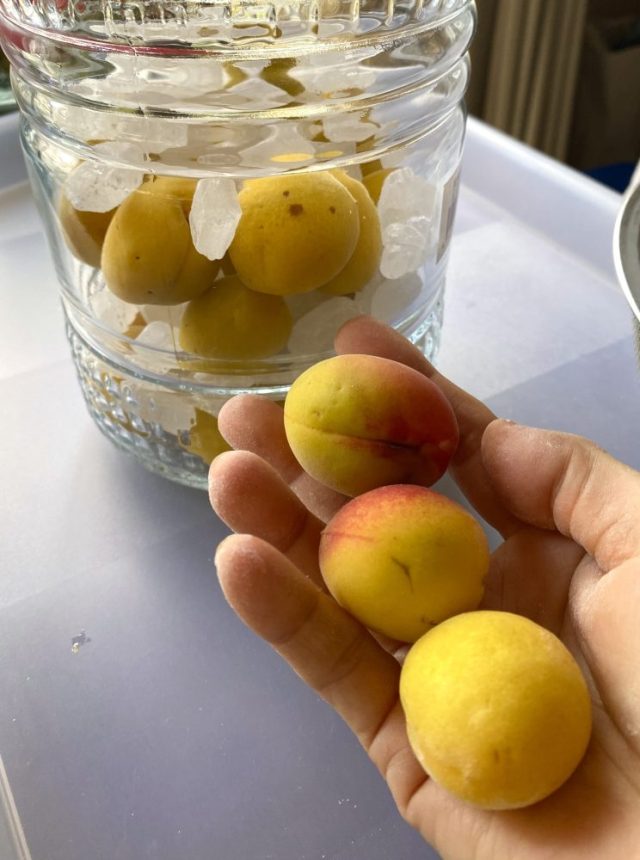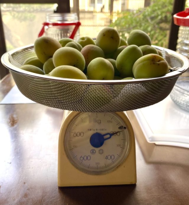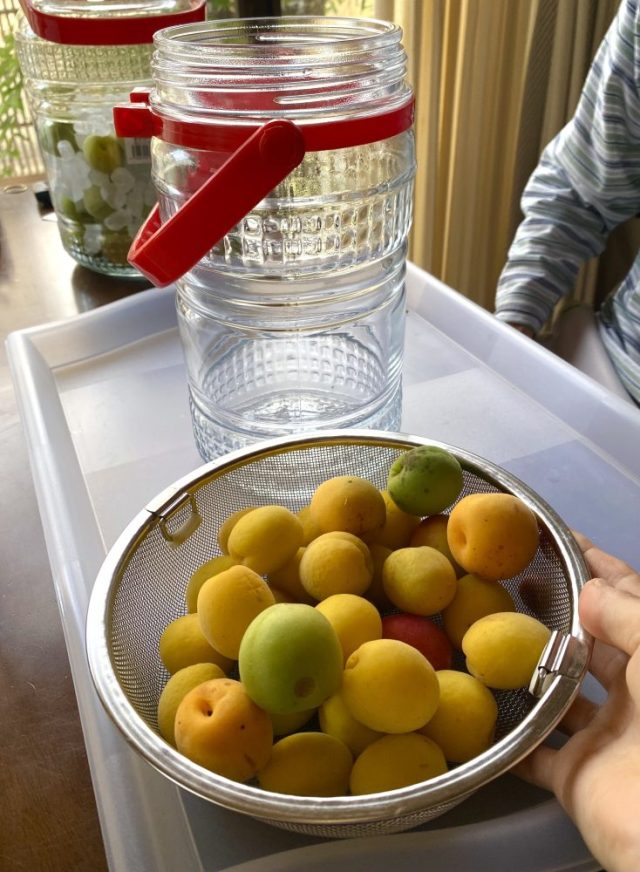 合わせてもこれだけ(写真)。黄色く色づいたうちの梅と、いただきものの青梅、それぞれで梅酒を作ろう〜という企画。