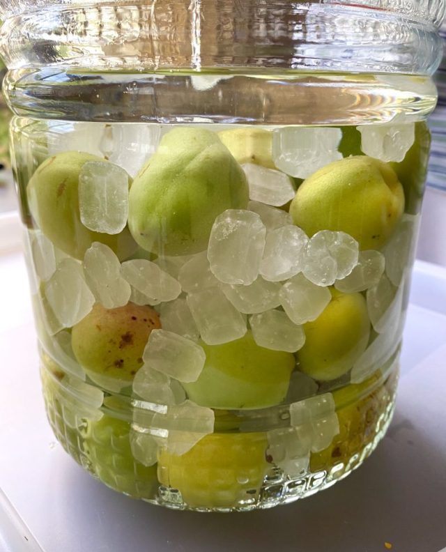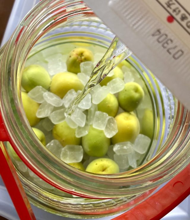 きっと天国から見守ってくれてるよね〜。梅、氷砂糖を交互に入れ、ホワイトリカーを注いでできあがり。あとはじっくり寝かすだけ。