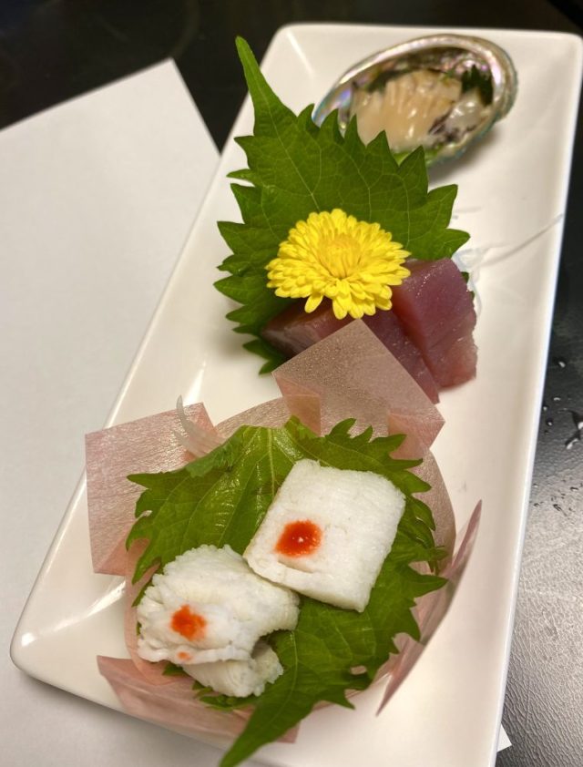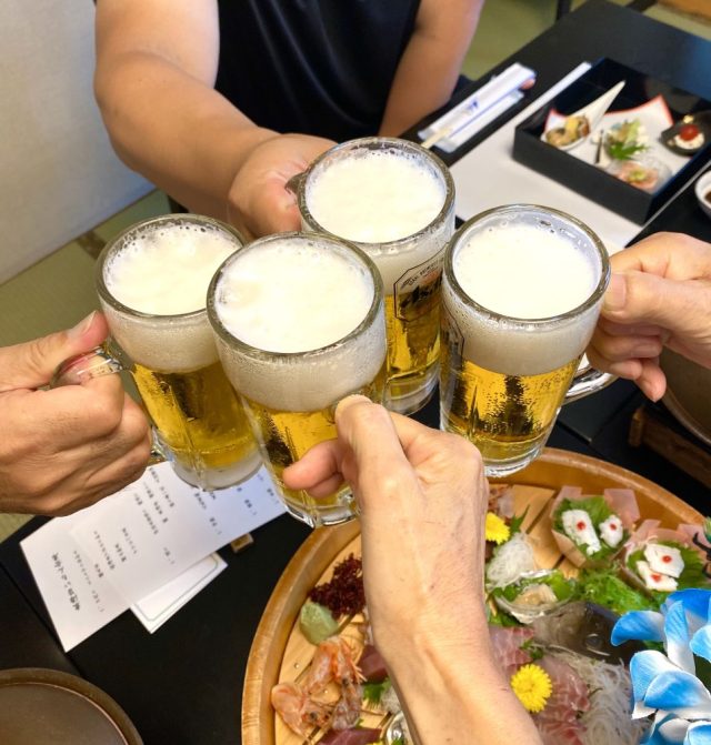 「うなぎがあるよ」「刺身がうまい」「きれいな盛り付け〜」「ドリンクお代わりは?」「僕はウイスキー」「私は梅酒」