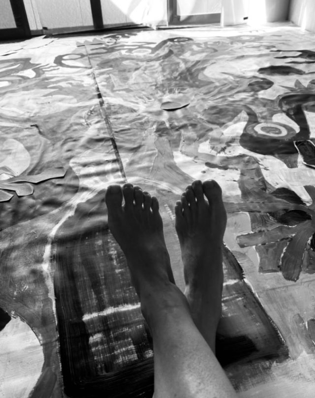 流浪の民で、ルームシェア生活が長く続いたので「こもりっきりになれる」幸せを満喫中。それも、床いっぱいにキャンバス地を広げて。絨毯のように、歩いたり座ったりひざまずいたり。全身でアートとたわむれる〜。
