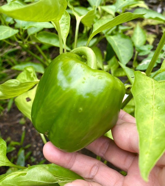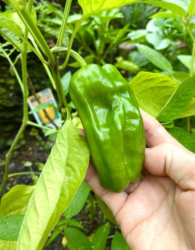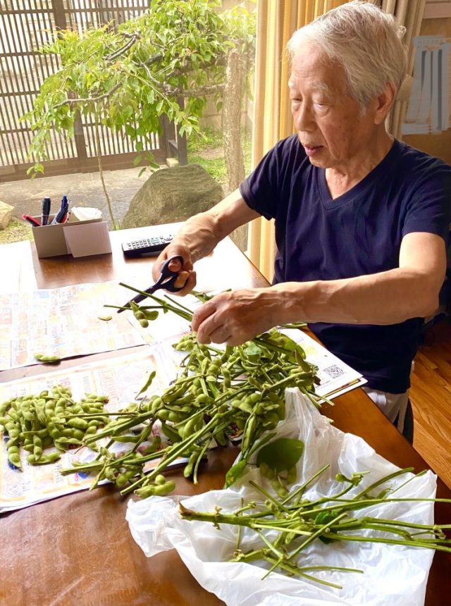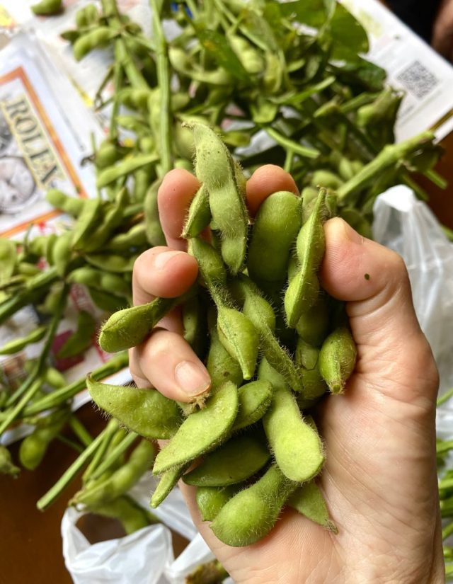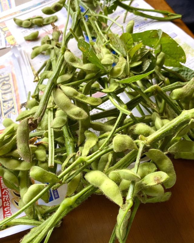 ありがたいのう。わさわさと茂った枝豆の束をいただく。おいしそ〜。今夜のビールのおつまみに決まり。お返しに、父が「ピーマンでもどうですか?」と差し出すも、