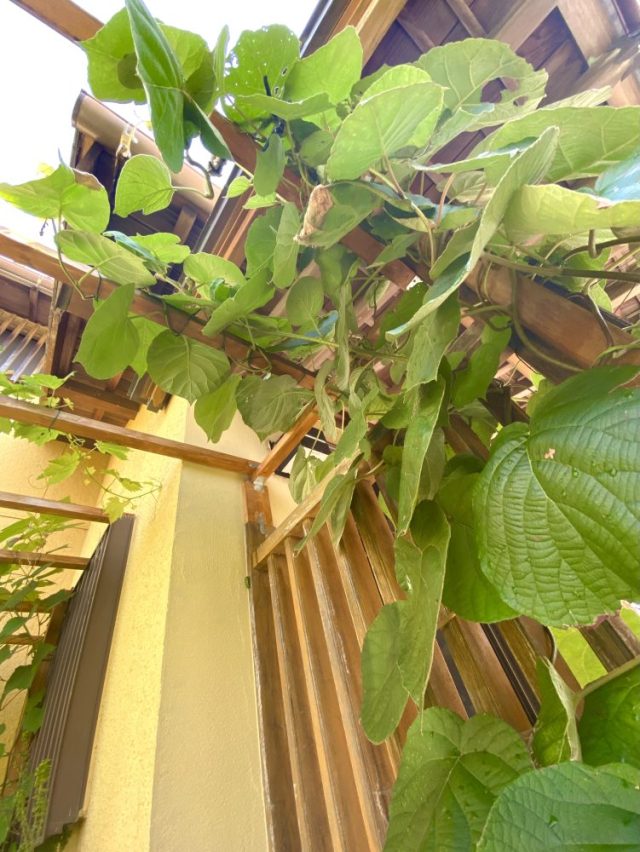 今年はオス株がぐんぐん伸びて、ご覧のとおり。ついに「天井」部分へ進出。この3ヶ月で、2メートル近く伸びた。すごいな〜。メス株の元気がイマイチで心配(アリの襲撃に遭っていたのが原因か?)。