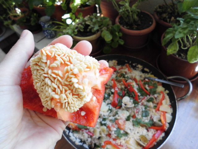 ぜいたく貧乏食堂 25.赤ピーマン&あさりのアロス 2013-12-09 momoquimidori コメントする 「ぜいたく貧乏食堂」25回目の今日は「赤ピーマン&あさりのアロス」を紹介します。できたてだから湯気立ってる~(笑) アロスはみなさんもうご存知ですね。そう「お米料理」のこと。パエリア、パエジャとも言いますが、マラガの一般家庭では「アロス!」 今日は、ねぎも入れてみました。あるものを何でも入れてOKなのが家庭料理。スペインの赤ピーマンは手のひらより大きい!中にはこんなに種がつまってます。鉢に植えると芽が出てくるのが楽しい~。 2013-12-09 momoquimidori コメントする