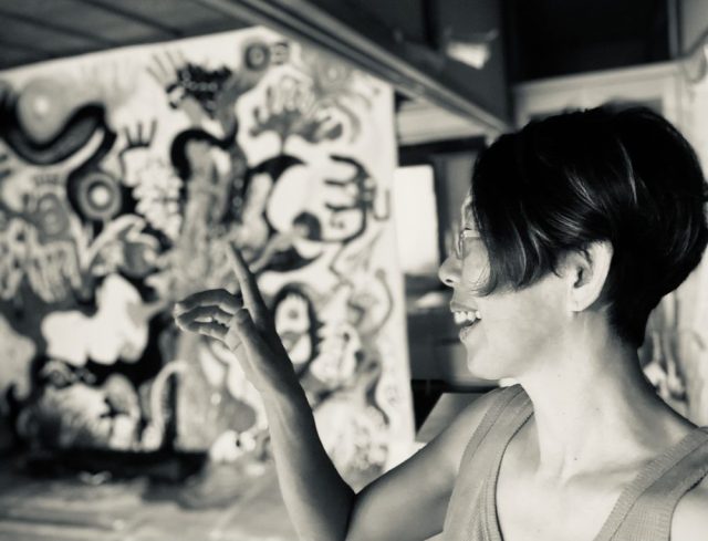 もともと下書きもないし、インスピレーションに従って。前進あるのみ。3メートル平方のキャンバス地に、4枚ある開き戸は覆い尽くされてしまったけれど、