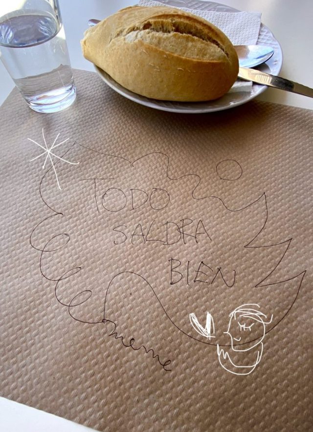 行きつけバルのテーブルクロスに、ボールペンで書きつける(写真)。「全てうまくいきますように」。私たちの祈りが、どうか通じますように。