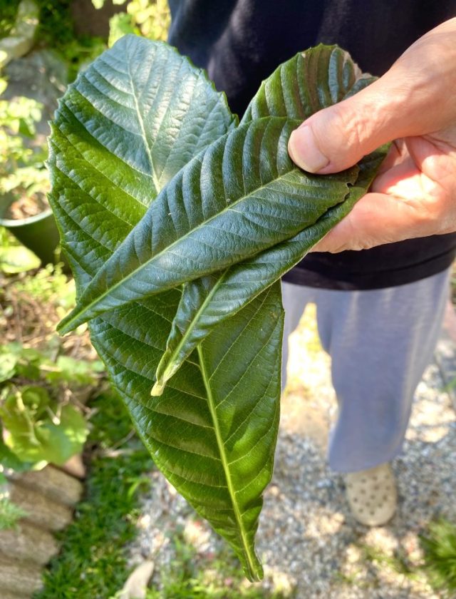 実は数年前に知った自然療法。葉っぱを巻いて、痛みを取る。そのためにわざわざ、びわの苗を買いに行き、庭2箇所に植えたのだ。
