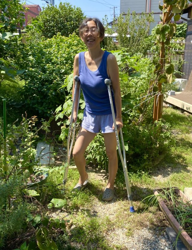 さっそく右手に松葉杖、左手をフリーに。これだけでできる作業、可能性がぐっと増えた。昨日の激痛が「ただの痛い」になったので、松葉杖なしで歩いてみる。左足重心で、なんとな5分ならいけそう。