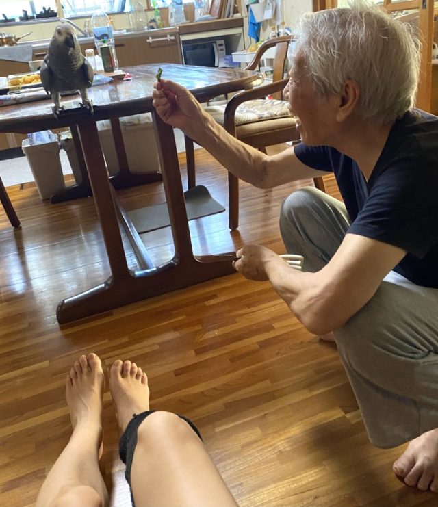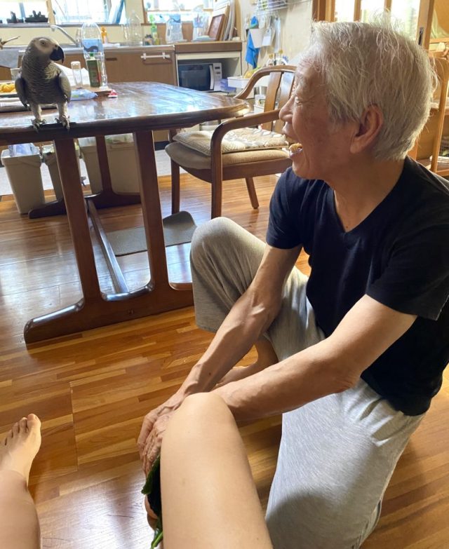 歓びで鼻の穴をふくらませる私に、父は呆れながらもびわの葉を取って来てくれた。葉っぱ4枚を洗って乾かし、ふくらはぎへそっと当てる。レッグウォーマーで優しく押さえつける。2人の楽しげな声を聞きつけ、ココが飛んでくる。