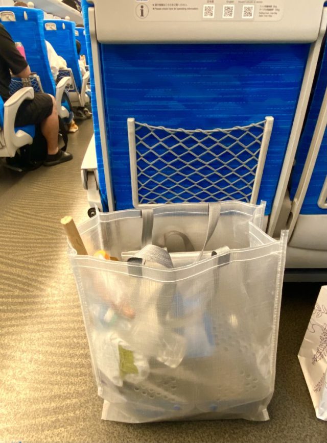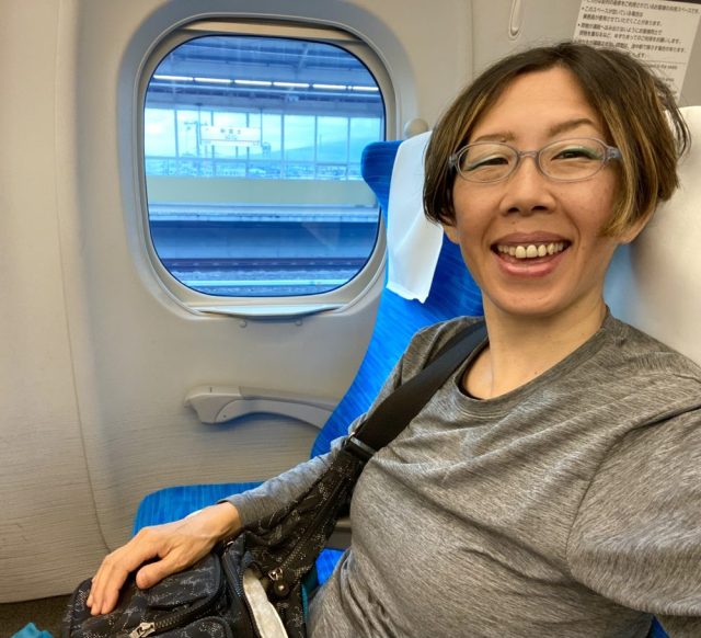 さらに、新幹線で東京から豊橋へ。ずっと眠っていたココが、静岡辺りで目を覚ます。「ひゅいっ」「ぷぷっ」と声を上げる始めと、隣のお兄さんが、怪訝な表示で辺りを見回す。