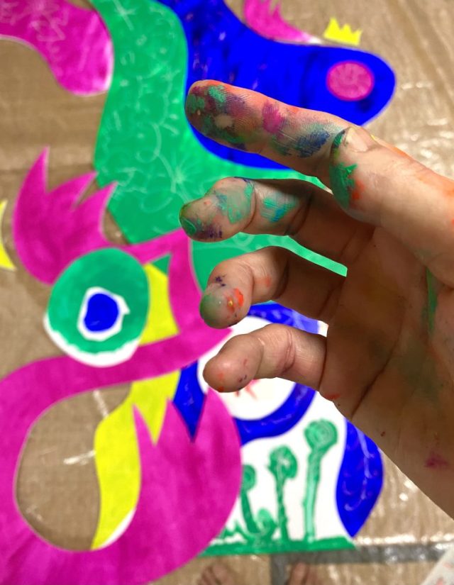 あぁあ、よかった〜。わずか20センチの差で助かった。気を取り直して、制作を再開。2メートル以上あるので、床に置いてペイント。とにかく