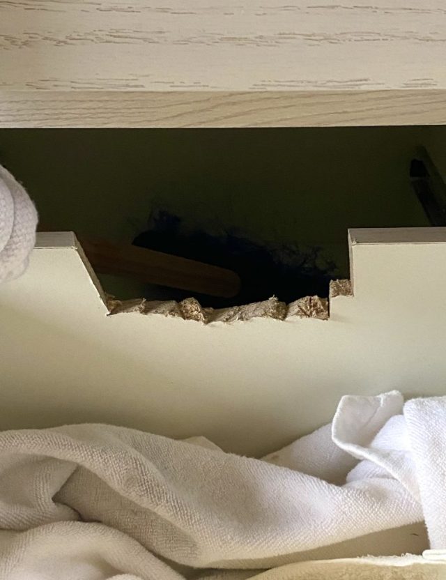 らしいのだが、隙間が狭くて通れない。そこで、板をカットし「通路」を作ってあげることに。ガリガリ。ゴリゴリ。しばしノコギリ作業。10分ほどで、でこぼこではあるが通路が完成。