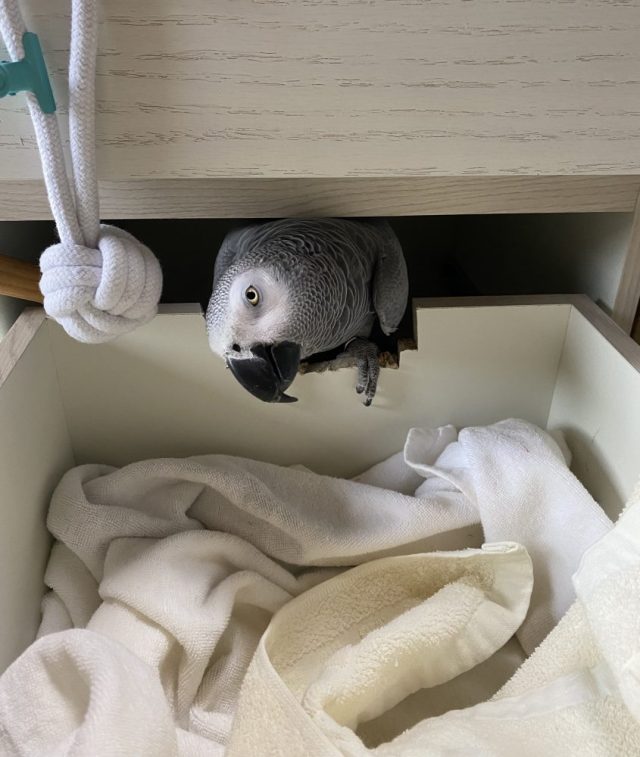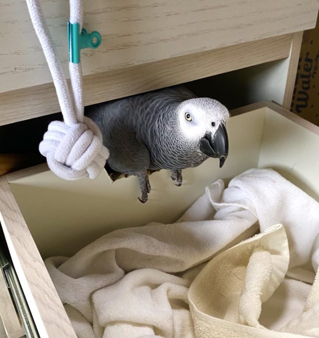 すぐに飛んでくるココ。新しくできた通路を使って、行ったり来たり。ごきげんさん。よかったのう〜。さっそく自分のお気に入りのおもちゃや布を運び込んでいる。