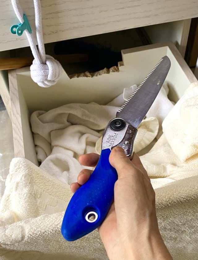 ミニノコギリを手に、ココのテリトリーである「引き出し」に立ち向かう。実はこの「引き出し」、ココの「巣」であり、1日を過ごすメインスペース。出たり入ったりして遊ぶのだが、ここで問題が発生。