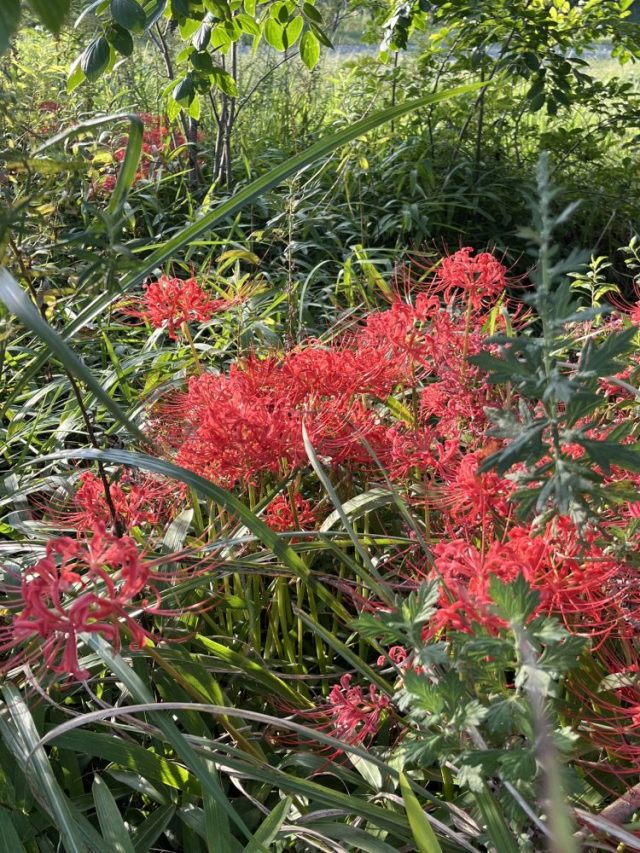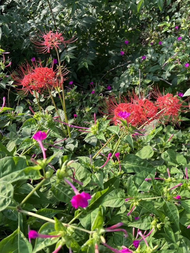 帰り道、彼岸花とオシロイバナの群生に出会った。土手や空き地に勝手に生えている、という感じがいい。雑草感というのか。うれしくなって近づいてみると、