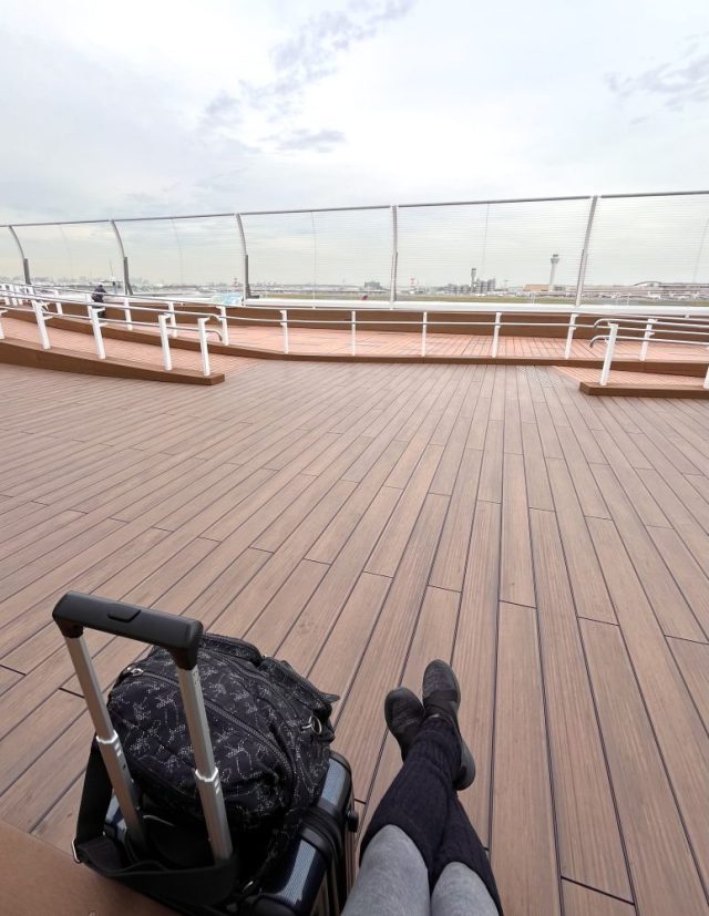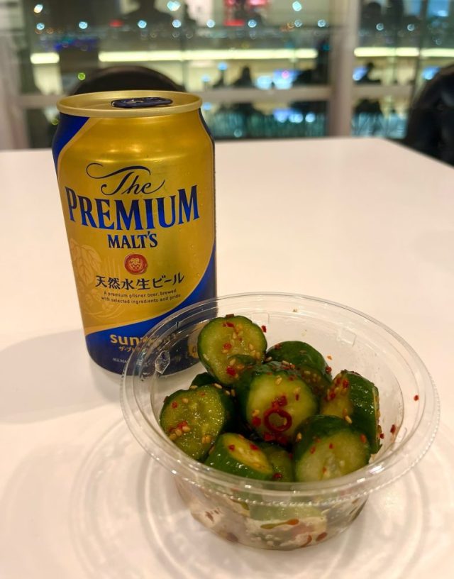 ベンチに座ってのんびり読書。ショップめぐりをし、ストレッチ&筋トレをし、搭乗手続きを終え、小腹が空いたのでコンビニへ。缶ビールとつまみで再び乾杯。