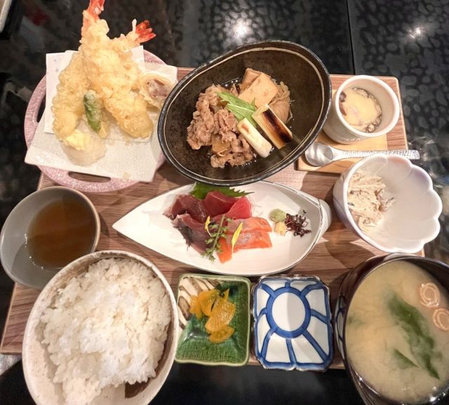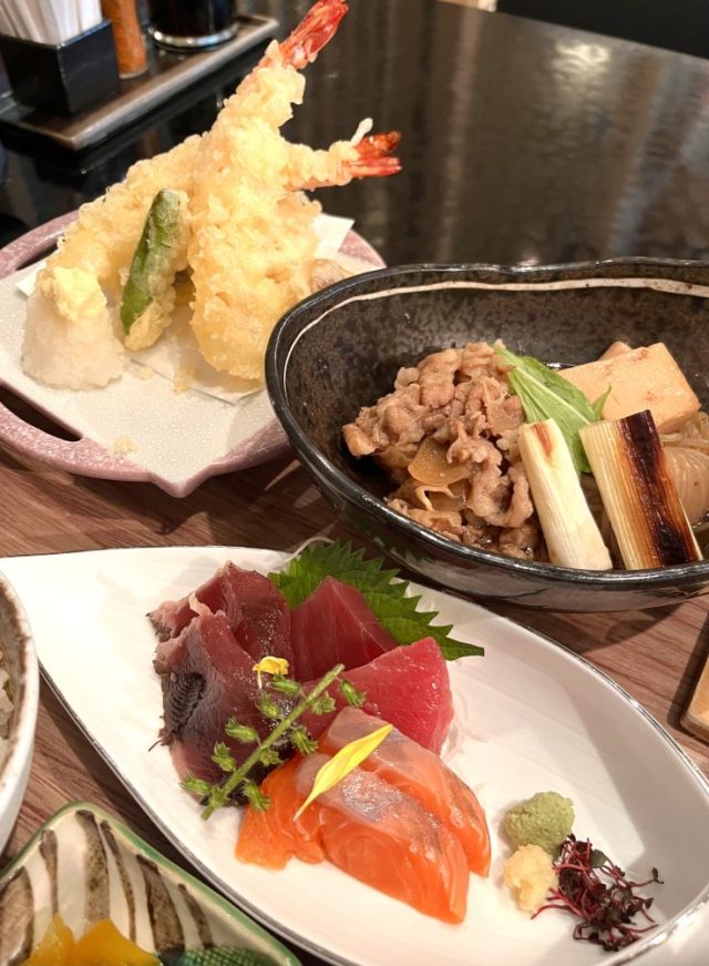 掘りごたつのある居酒屋風の店へ。おすすめの「天ぷら、刺身、すき焼きのセット」を注文。これならゆっくり飲めそうや〜。そこで、はたと気づく。このセットって、外国人観光客が、
