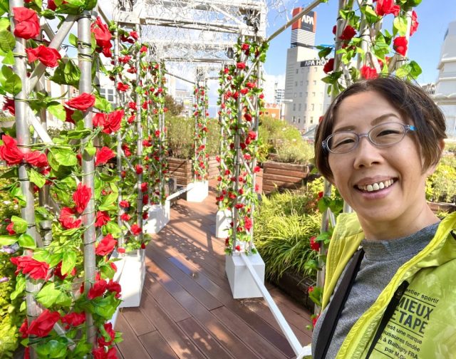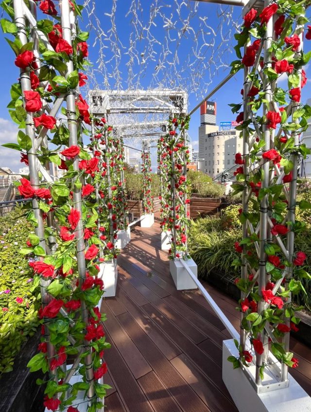 花の町・豊橋なので、季節ごとに花壇の花が変わる。写真のような「花のトンネル」もできていた。造花だけど、夜にはイルミネーションになるみたい。