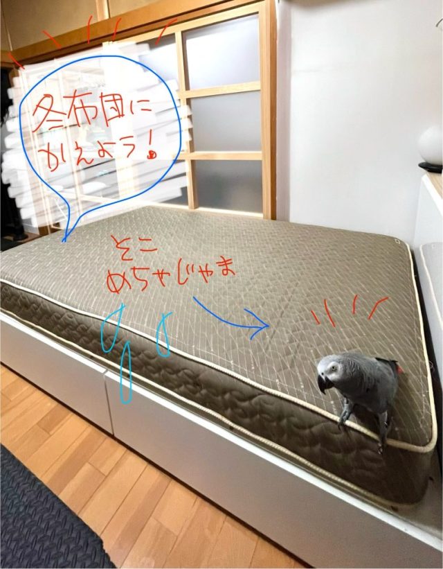 と作業は続く。ウッドデッキに干しておいたぽかぽかの「冬布団」を、両腕に抱え寝室へ。よろよろ運び込んでいると、さっそくココが飛んでくる。