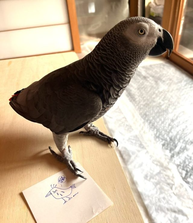 笑。オウムにモデルになってもらって〜。ダンス教室のある催しに「すみません、用事で行けません。残念です」のメッセージと共に。すぐに返事が届き、