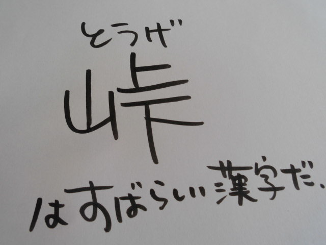 怪しい日本語 峠 2014-09-29 momoquimidori コメントする 「怪しい日本語」今日は「峠(とうげ)」を紹介します。今回は、私の怪しい日本語の話ではなく、「峠」という字を書いて「感動した」という話です。よく見てください。「峠」。なんとすばらしいのでしょう。山の、上と下、と書く。まさに「峠」。ははぁー。 日本でお暮らしのみなさんは、別にこういう字じゃん、と思うだけかもしれませんが、スペインに長く暮らしているとこの意味合い、まるで景色を閉じ込めたようなこの一文字に深い感動をおぼえるのです。 ああ、峠よ、ありがとう。 2014-09-29 momoquimidori コメントする